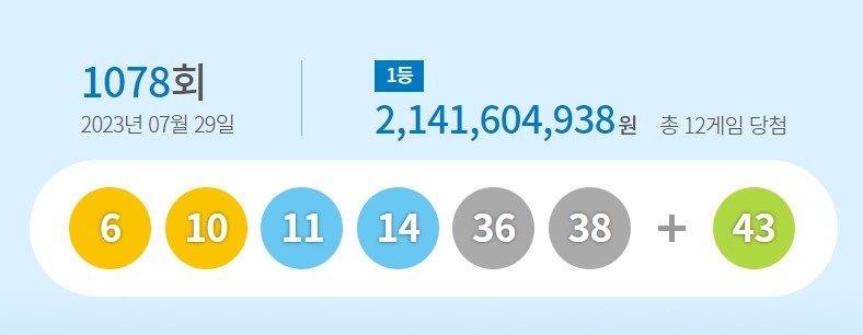 [서울=뉴시스] 김진엽 기자 = 29일 제1078회 동행복권 로또 추첨 결과 '6, 10, 11, 14, 36, 38'이 1등 당첨 번호로 결정됐다. 2등 보너스 번호는 '43'이다.