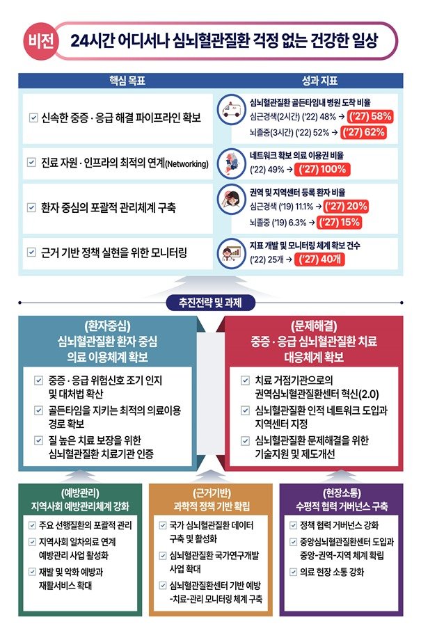 필수의료 현장의 문제해결을 위해 중증·응급 심뇌혈관질환 치료 대응체계도 확보한다. 현재 전국 14개 권역에 지정 운영 중인 권역심뇌혈관질환센터를 내·외과 포괄적 전문치료 역량을 갖춘 심뇌혈관질환 예방, 치료, 관리 전주기 통합 거점기관으로 개편한다. 또 심뇌혈관질환 분야 중증·응급 대응 부담으로 인한 전문의 소진과 이탈을 완화하고 이송 시간을 단축하기 위해 전문의 진료 협력체계를 지원하는 심뇌혈관질환 인적 네트워크를 도입한다. 네트워크는 질환별, 치료방법별 골든타임 내 도달 가능한 범위의 서로 다른 의료기관에 소속된 최소 7인 이상으로 구성된다.