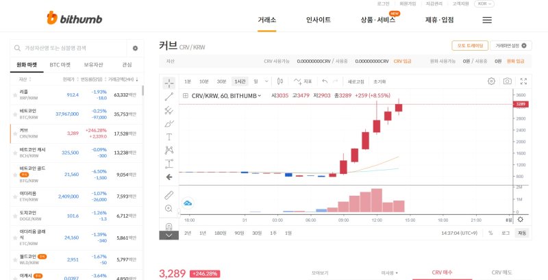 빗썸에서 30분만에 최대 80%까지 상승한 커브는 이날 오후 2시35분까지도 계속해서 상승 추세를 그리면서 최대 255%까지 상승했다.
