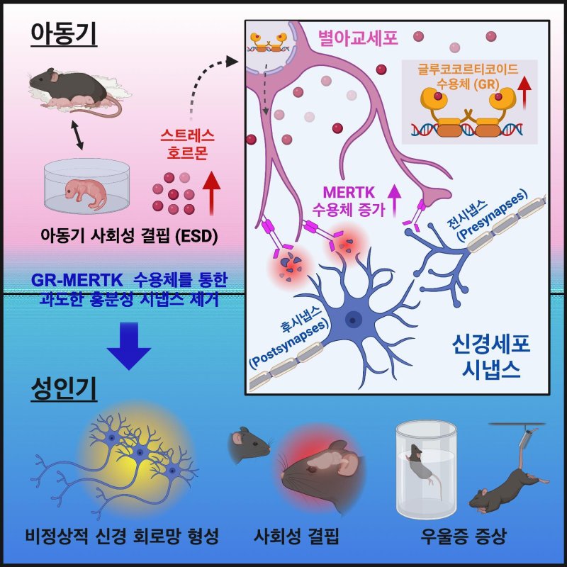 연구팀은 뇌에서 면역기능을 담당하는 별아교세포가 스트레스 호르몬에 반응해 과도하게 흥분성 시냅스를 제거하는 현상이 아동 학대 및 방임에 따른 정신질환 발병의 주요 원인임을 밝혀냈다.