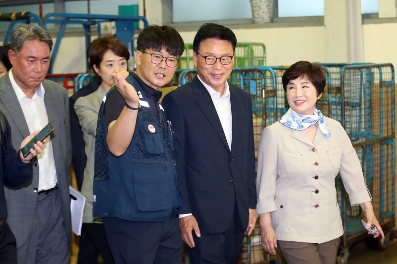 이날 박 원내대표는 물류센터 작업 현상을 시찰한 후 우편물류센터 현장 노동자들을 만나 애로사항 및 대책에 대한 의견을 청취했다.