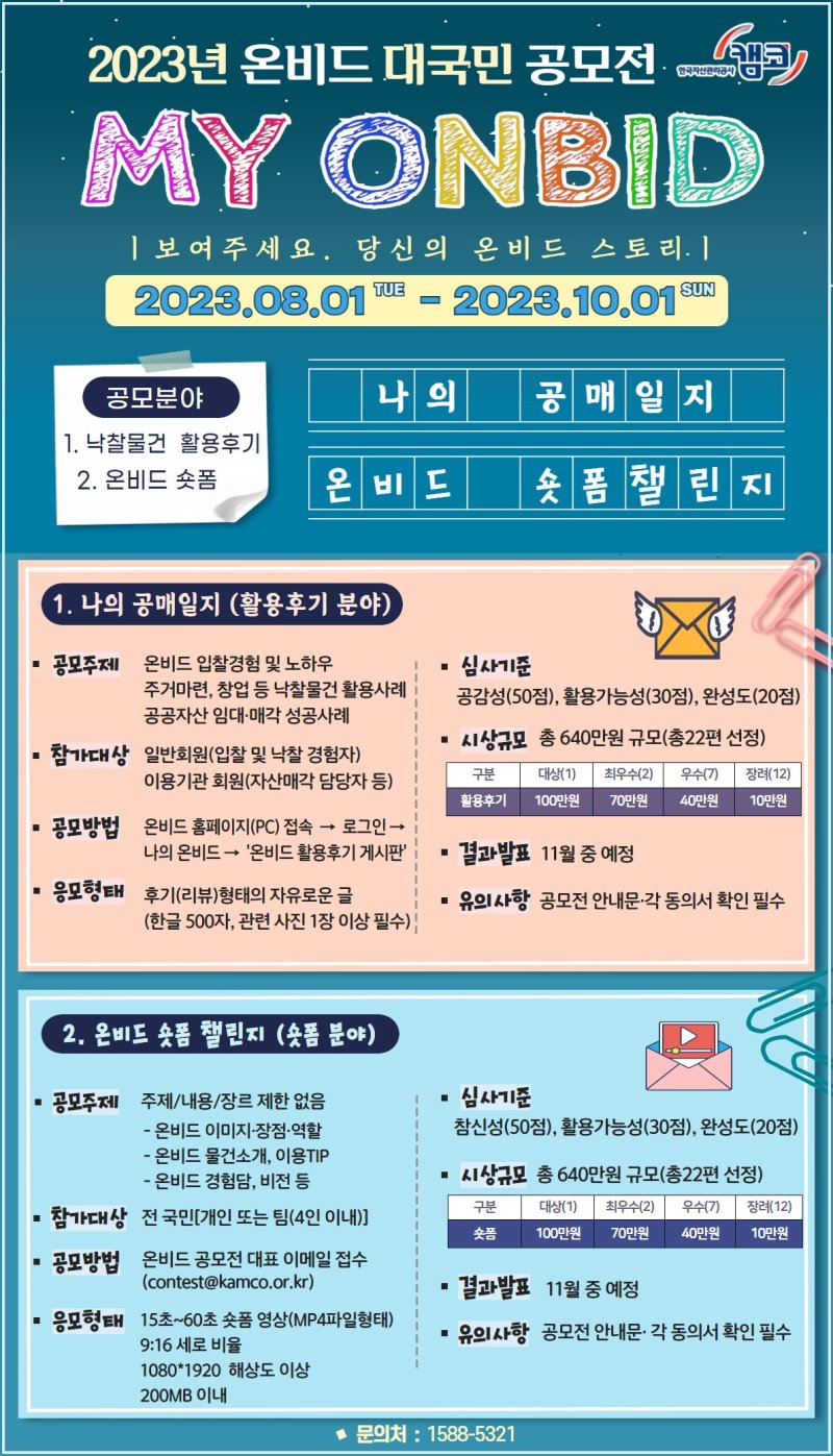 공모분야는 △낙찰물건 활용후기(나의 공매일지)와 △온비드 숏폼(온비드 숏폼 챌린지) 2가지 분야다.