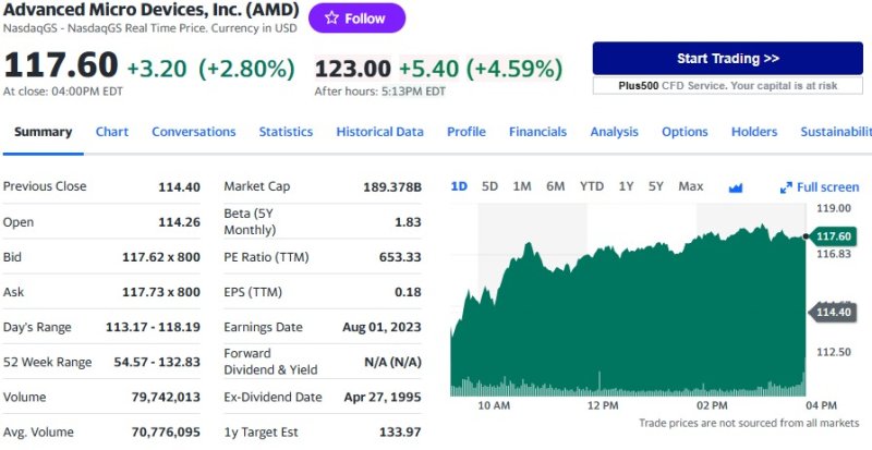 AMD는 1일(현지시간) 뉴욕증시 시간외거래에서 4.59% 급등한 123.00 달러를 기록하고 있다. 앞서 정규장도 실적 기대로 2.80% 상승한 117.60 달러로 장을 마감했었다.