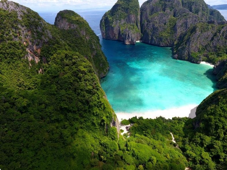 끄라비주 피피섬에 있는 마야 베이는 2000년 개봉한 리어나도 디캐프리오 주연 영화 '비치'의 촬영지로 유명해진 곳으로, 석회암 절벽과 에메랄드빛 바다가 만든 절경을 직접 보기 위해 많은 관광객이 몰려들었다.