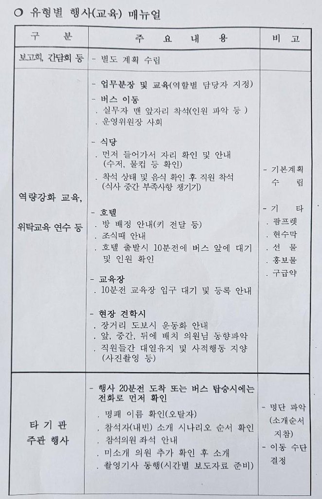비공개로 작성된 이 문건의 세부 내용을 살펴보면 여행 가방 등 받아 싣기, 버스에서 여행 가방 등 꺼내놓기, 조식 때 직원 미리 내려와서 안내 및 인사, 호텔 출발 시 10분 전에 버스 앞에 대기 및 인원 확인 등이 있었다.