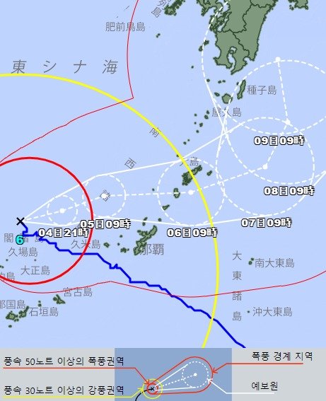 5일 예상되는 순간 최고 풍속은 오키나와, 아마미 지방에서 초속 45m, 규슈 남부 30m이며 5일 오전 6시까지 24시간 동안 예상 강수량은 오키나와 150mm, 아마미 100mm, 규슈 남부 80mm다.