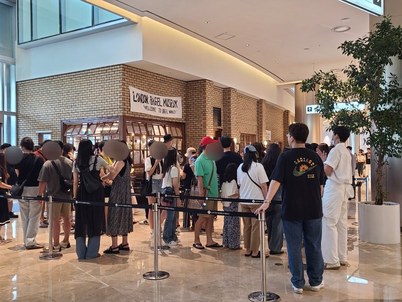 개점은 오전 10시30분이지만 매장과 가까운 롯데월드몰 14번 게이트 문 밖엔 오전 9시 무렵 20여명이 대기하며 이른바 '베이글 오픈런' 중이었다. 롯데백화점은 온열질환 방지를 위해 전날 오전 9시부터 게이트를 개방해 건물 내부에 줄을 세웠다.