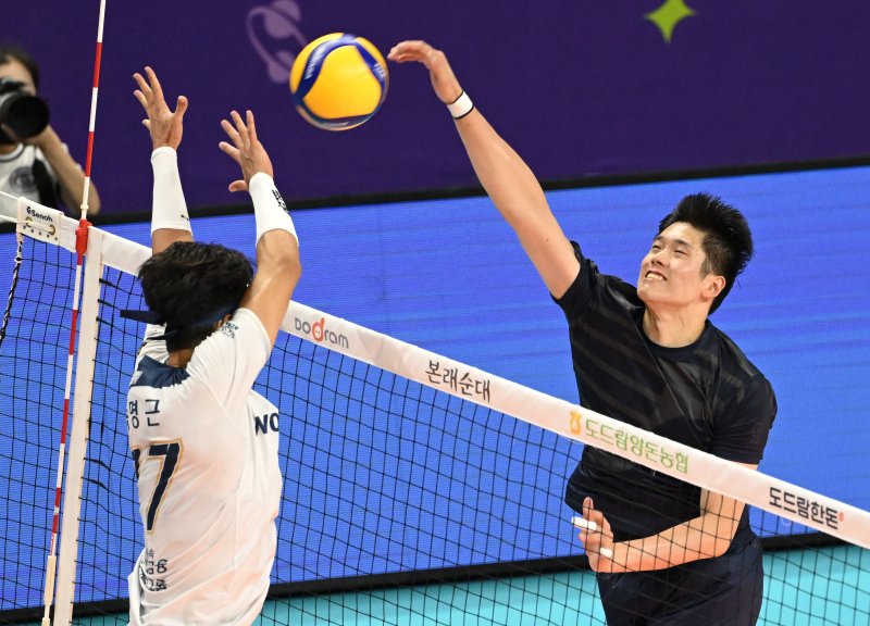 (서울=뉴스1) 이재상 기자 = 이가 없으면 잇몸이다. 남자 프로배구 '1강' 대한항공이 주축 선수들의 대표팀 차출 이탈 속에 '포지션 파괴'를 통한 새로운 배구를 선보이고 있다. 미들블로커 진지위(30)와 조재영(32)이 아포짓 스파이커로, 세터인 정진혁(23)도 날개 공격수로 뛰는 등 제대로 된 '잇몸 배구'를 펼치고 있다.
