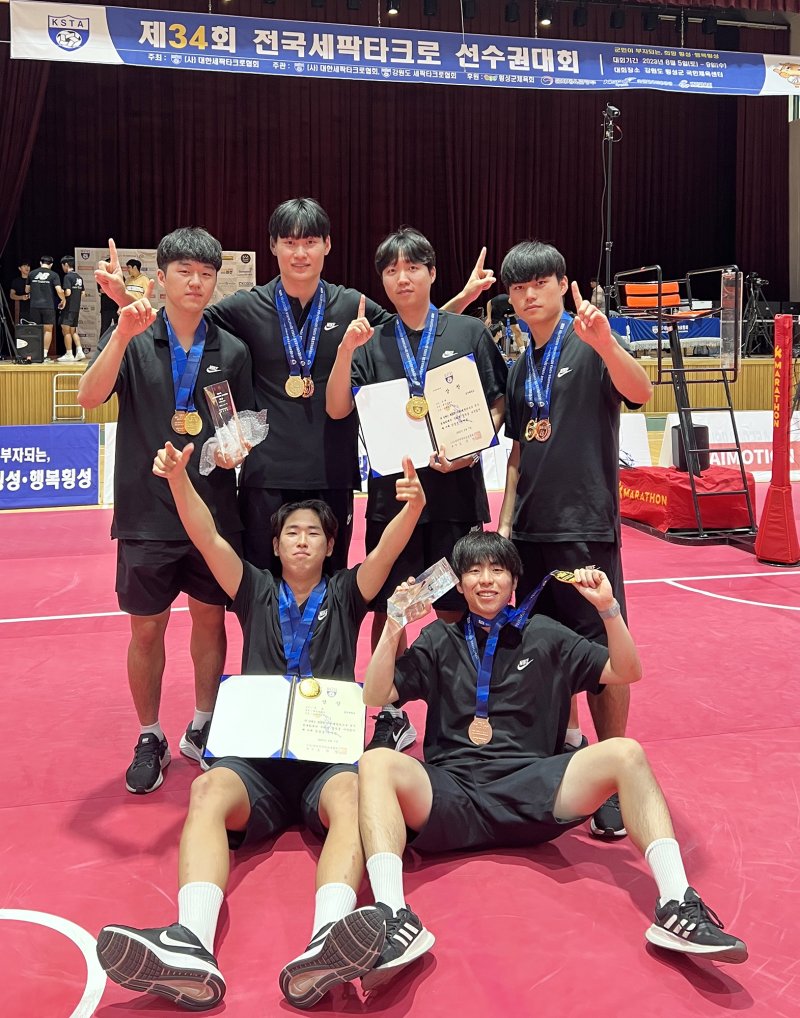 9일 동신대에 따르면 세팍타크로팀은 지난 5일부터 5일간 강원도 횡성 국민체육센터에서 열린 '제34회 전국세팍타크로 선수권대회'에 남자 대학부 4인조로 출전해 금메달을 땄다.