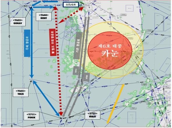 이에 따라 태풍이 동남아 방면 항공로에 영향을 미치는 시간대에는 서해상 항공로로 우회하거나 결항 조치할 예정이다.