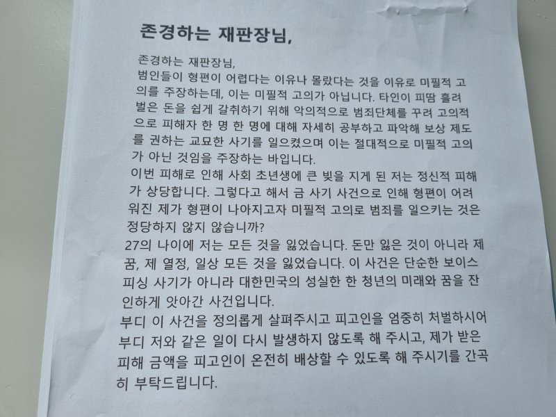 (남양주=뉴스1) 양희문 기자 = "27살 나이에 돈, 꿈, 열정, 일상 모든 것을 잃었습니다. 이 사건은 단순한 보이스피싱(전화금융사기) 사기가 아니라 대한민국의 성실한 한 청년의 미래와 꿈을 잔인하게 앗아간 사건입니다. 존경하는 재판장님, 부디 이 사건을 정의롭게 살펴주시길 바랍니다."