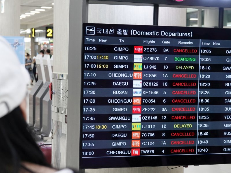 이날 오후 8시 기준 당초 운항 예정이던 국내선 460편(출발 234·도착 226)과 국제선 30편(출발 15·도착 15) 등 총 490편 가운데 국내선 152편(출발 77·도착 75), 국제선 14편(출발 7·도착 7) 등 166편이 결항했다.