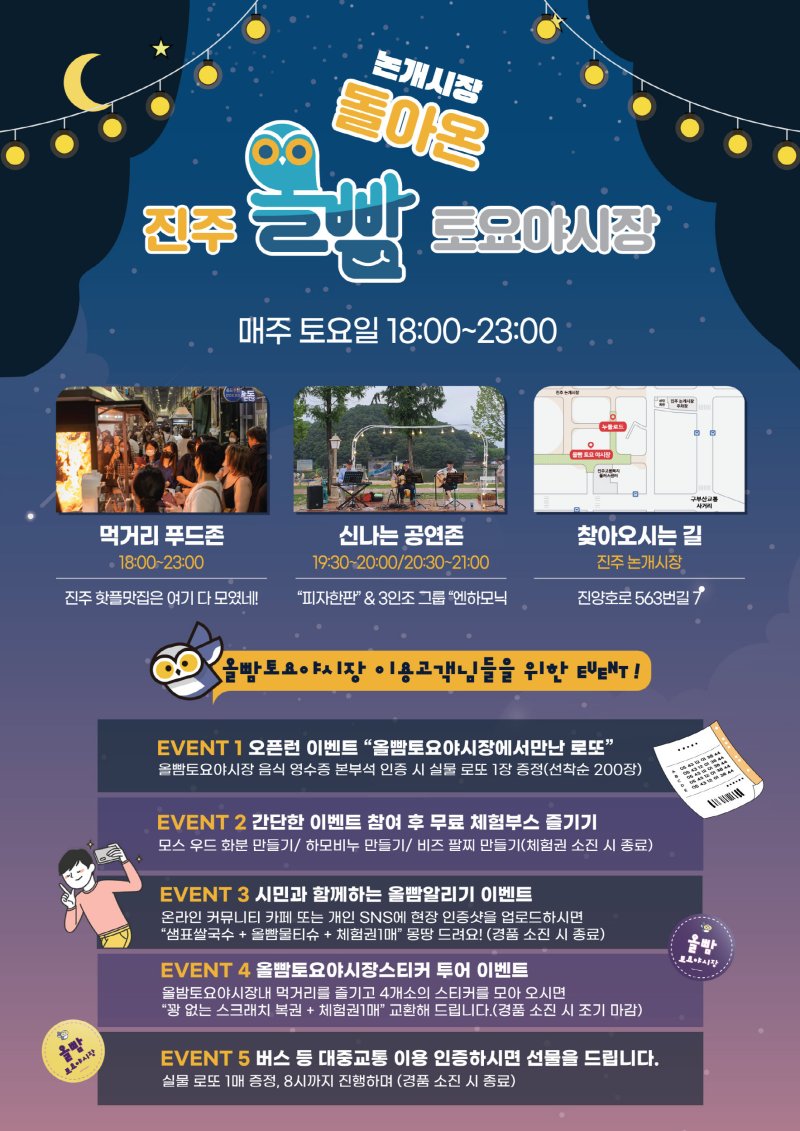 진주시상권활성화재단 관계자는 "지난해 8월 개장한 올빰야시장이 지역의 핫플레이스로 자리잡았다"며 "올해는 시장 상인과 시민이 직접 참여하는 지속가능한 축제가 될 수 있도록 최선을 다하겠다"고 말했다.