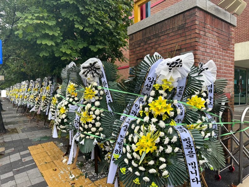 태풍 '카눈'의 영향으로 거센 비바람이 몰아치는 10일 오후 3시50분께 경기 의정부시 호원초등학교 주변에는 화환이 줄지어 서 있었다.
