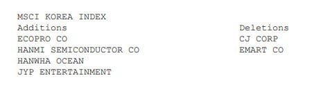 한국지수의 경우 에코프로, 한미반도체, 한화오션, JYP Ent 등 4개의 종목이 편입되고 CJ와 이마트 등 2개의 종목이 편출됐다.