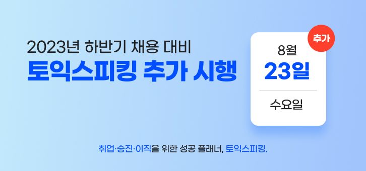 토익스피킹 추가 시험은 오는 23일 오후 6시30분에 시행될 예정이며, 성적 발표는 이달 29일에 진행된다.