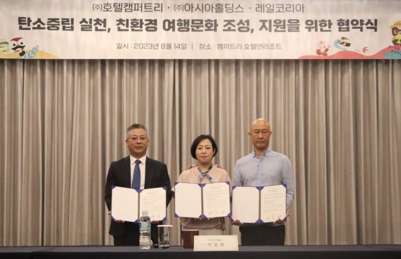 (서울=뉴스1) 김동규 기자 = ㈜호텔캠퍼트리는 ㈜아시아홀딩스, 레일코리아와 함께 제주 캠퍼트리 호텔앤리조트에서 탄소중립 실천과 친환경 여행문화 조성 및 지원을 위한 업무 협약을 체결했다고 14일 밝혔다.