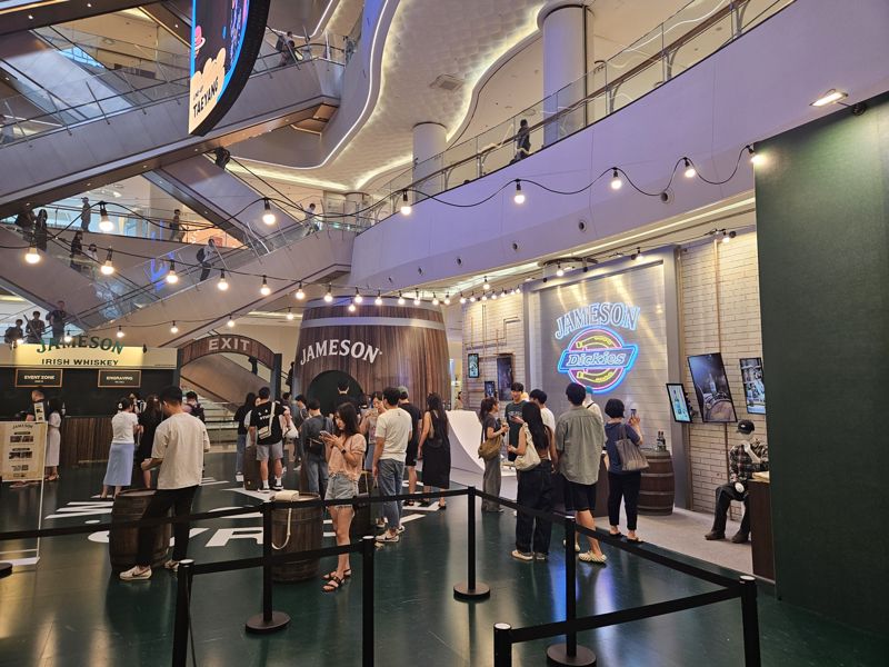롯데백화점이 오는 23일까지 여는 위스키 브랜드 '제임슨'의 팝업스토어는 대형 쇼핑몰 한복판에서 위스키를 직접 만들고, 눈으로 보고, 입으로 맛볼 수 있는 체험형 공간이다. 행사 4일 차인 14일, 100평 규모의 잠실 롯데월드몰 1층 아트리움에 들어선 거대한 제임슨 팝업스토어를 직접 가봤다. 팝업스토어 공간은 제임슨 위스키 고유의 색깔인 짙은 녹색을 배경으로 오크통(배럴)을 곳곳에 배치해 아일랜드에 있는 제임슨 위스키 증류소 분위기를 그대로 재현했다.
