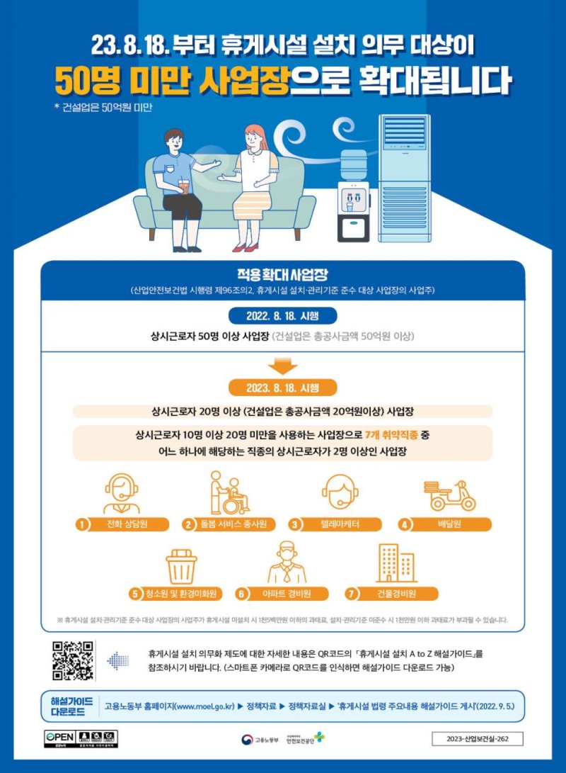 고용부에 따르면 산업안전보건법(산안법) 개정으로 지난해 8월18일부터 50인 이상 사업장에 대한 휴게시설 설치가 의무화된 데 이어 오는 18일부터는 대상이 50인 미만 사업장으로 확대된다.