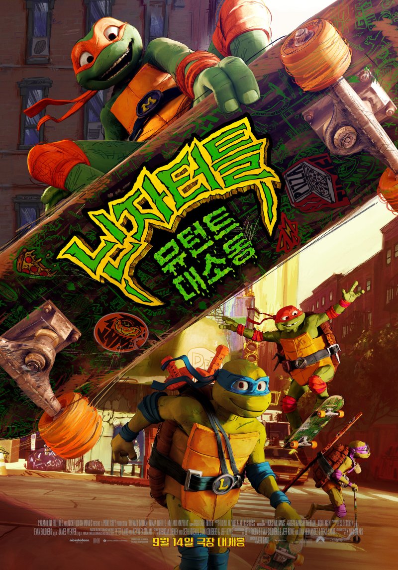 이번에 공개한 메인 포스터는 스케이트 보드를 타고 날아오른 미켈란젤로와 라파엘, 레오나르도, 킥보드를 탄 도나텔로의 모습을 독특한 색감과 유니크한 그림체로 담아냈다. 각기 개성 넘치는 포즈를 취하고 있는 '닌자터틀'의 모습은 하수구에 숨어 사는 생활에서 벗어나 평범한 10대로 살고 싶은 꿈을 가진 형제들이 뉴욕의 길거리를 누비며 맞이할 모험에 관심을 갖게 만든다.