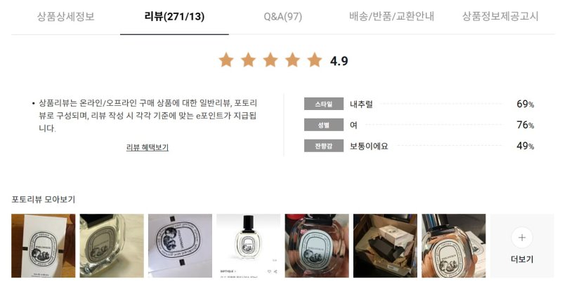 이에 앞서 신세계인터내셔날은 향수 제품의 리뷰도 개편했는데, ▲스타일 ▲성별 ▲잔향감 등을 추가해 향을 직접 맡지 않아도 어느정도 파악할 수 있게끔 했다.