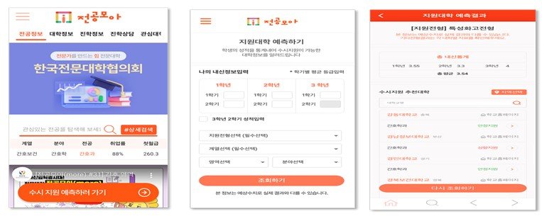 한국전문대학교육협의회(전문대교협)는 24일 전문대 입학정보 모바일 앱 '전공모아'에 수시 지원대학 합격예측 기능을 추가했다고 밝혔다.