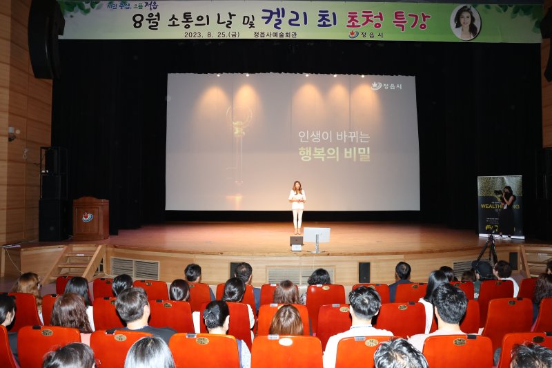전북 정읍시는 25일 정읍사예술회관에서 직원 600여명이 참석한 가운데 8월 소통의 날 행사와 함께 정읍 출신의 세계적인 여성 기업인 켈리 최를 초청해 특강을 개최했다.