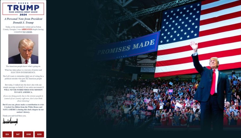 머그샷을 바이든 정부의 선거 개입 및 정치 탄압의 결과로 포장하면서 2024년 대선 승리를 위한 정치자금 기부를 독려하고 티셔츠 등 상품 판매에 나선 것이다.