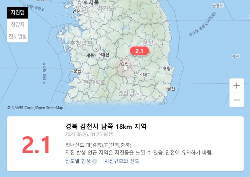 26일 오전 1시25분 33초 경북 김천시 남쪽 18㎞ 지역에서 규모 2.1의 지진이 발생했다. (네이버 지도 갈무리)/뉴스1