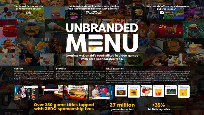 레오 버넷 그룹 마닐라(Leo Burnett Group Manila)가 출품한 맥도날드의 '언브랜디드 메뉴(Unbranded Menu)'는 필리핀의 가장 큰 영향력을 가진 게이머들과 협력해 그들이 게임 중에 햄버거, 감자튀김, 아이스크림 등의 가상 이미지를 찾아 스크린샷을 찍고 SNS에 해시태그와 함께 업로드하면 실제 맥도날드의 쿠폰을 발급해주는 이벤트를 진행했다.
