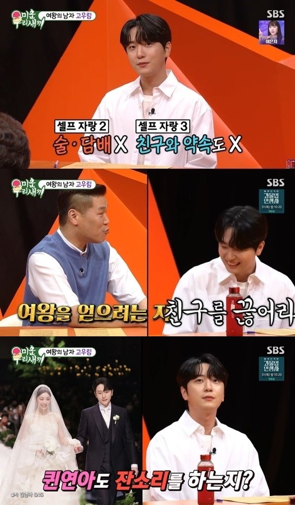 고우림은 "김연아도 잔소리를 하느냐"는 질문엔 "잔소리를 안 할 수는 없는 것 같다"고 답했다. "사소하지만, 요즘 날씨가 더워 식사 후 빨리 안 치우면 벌레가 꼬인다. (김연아가) '먹고 빨리 음식물 쓰레기통에 넣었으면 좋겠다'고 좋게 잔소리했다"고 털어놨다. "잔소리 하는데 저음이면 떳떳해 보이지 않느냐"면서 "조금 애교를 부리며 '할게요, 알았어요'라고 한다. 조금 하이톤이 된다"고 했다.