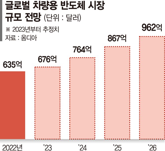 28일 업계에 따르면 다품종 소량생산 체계에 저가제품 위주의 시장이었던 차량용 반도체 시장이 자율주행, 인포테인먼트 기능 강화 트렌드에 고성능 반도체 수요처로 급부상하면서 '반도체 공룡'들이 시장 공략을 위한 청사진을 잇따라 발표하고 있다. 과거 차량용 반도체 칩 가격은 모바일용 애플리케이션 프로세서(AP) 대비 10분의 1 수준으로, 마진도 모바일 AP보다 낮은 '돈 안 되는 제품'이었다.