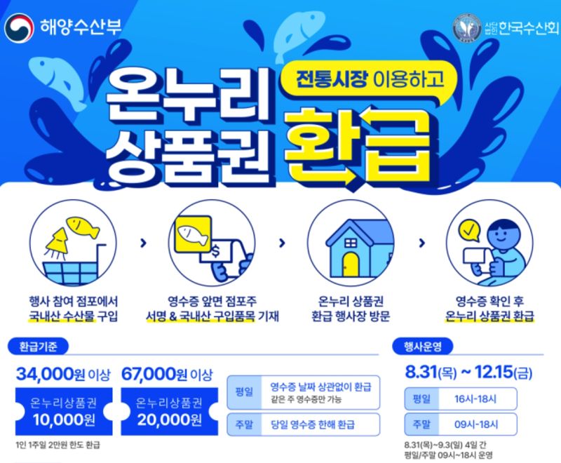 행사 기간 동안 수산물을 3만4000원 이상 구매하면 온누리상품권 1만원권을, 6만7000원 이상 구매하면 온누리상품권 2만원권을 지급한다.