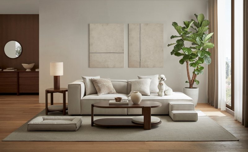몽스 소파는 간결한 실루엣을 바탕으로 한 모던한 디자인의 모듈형 소파로, 디자인 설계부터 소재까지 반려동물과 사람이 함께 사용할 수 있도록 했다.