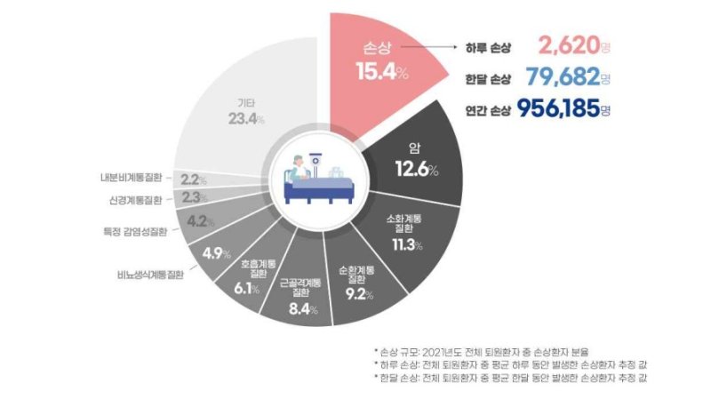3일 질병관리청이 발표한 '2021년 퇴원손상통계'에 따르면 2021년 우리나라의 전체 입원환자는 622만5014명으로 조사됐다. 이 중 몸을 다쳐 입원한 손상환자는 95만6185명(15.4%)로 1위를 차지했다. 암은 12.6%, 소화계통 질환은 11.3%로 그 뒤를 이었다.