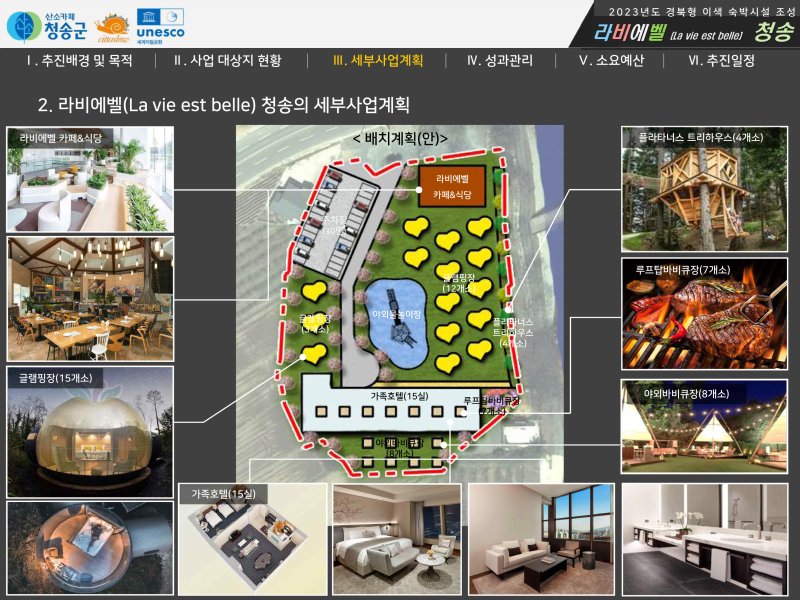 2026년 상반기 준공을 목표로 가족형호텔 15실(1840㎡), 청송사과 글램핑장 15개소(630㎡), 바비큐장 15개소(240㎡), 트리하우스 4개소(100㎡), 라비에벨 카페&식당 256㎡, 야외물놀이장, 주차장 등으로 꾸며진다.