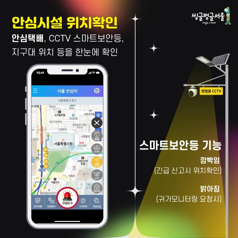 서울시민의 생활안심 필수 앱을 다운로드 해 서울에 사는 누구나 긴급신고, 귀가모니터링, 안심귀가택시, 안심귀가스카우트 예약 등 다양한 안전귀가 서비스를 이용할 수 있다.