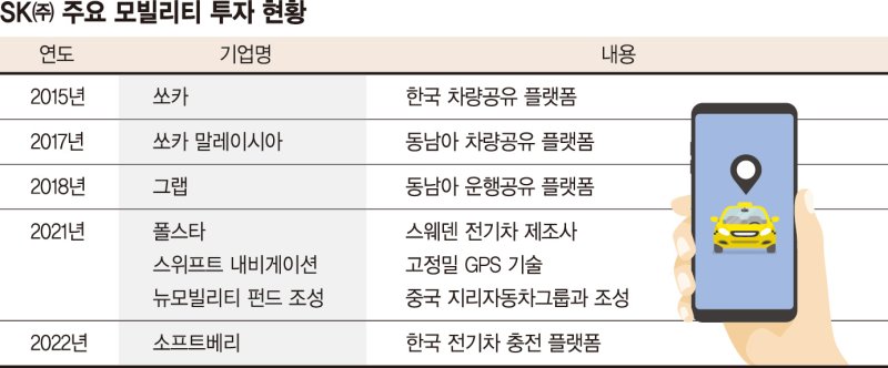 지난 2015년 쏘카 이후 SK가 투자하고 있는 모빌리티 관련 투자는 △2018년 그랩(동남아 운행공유 플랫폼) △2021년 폴스타(스웨덴 전기차 제조사) △2021년 스위프트 내비게이션(자율주행 핵심 고정밀 GPS 개발) △2021년 뉴모빌리티 펀드(중국 지리자동차그룹 협업) △2022년 소프트베리(한국 전기차 충전 플랫폼) 등이 대표적이다.