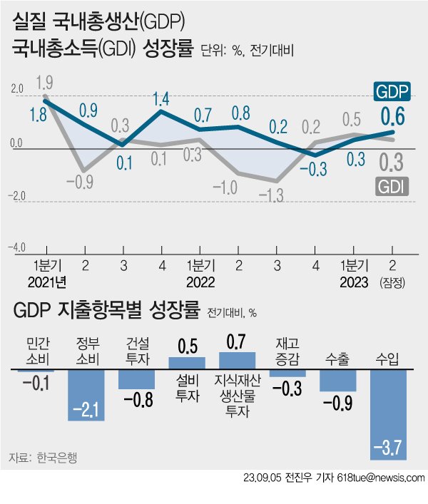 투자에서는 건설투자가 -0.1%p로 마이너스(-)를 보였고, 설비투자와 지식재산생산물투자가 각각 0.1%p를 나타냈다.