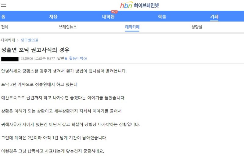국내 연구 인력 채용 정보가 공유되는 사이트 하이브레인넷에 한 이용자가 출연연의 박사후 연구원이라며 사직 제의를 받았다는 글이 이달 6일 올라왔다.