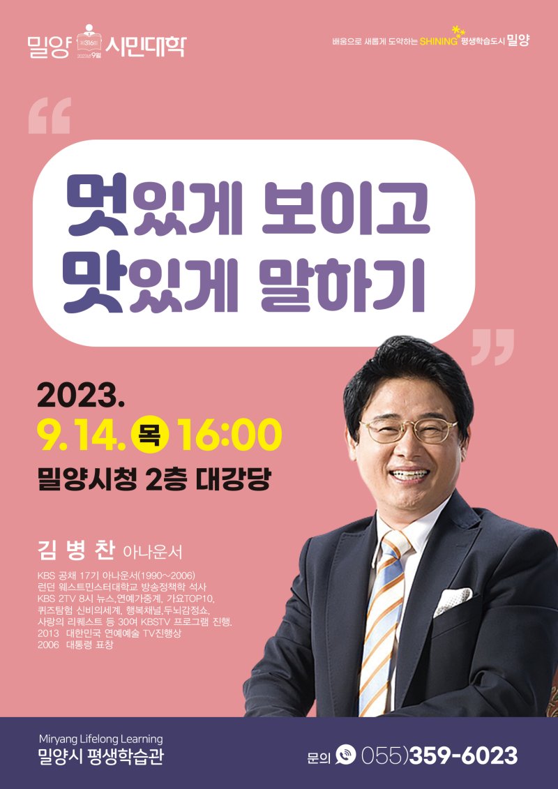 [밀양=뉴시스] 안지율 기자 = 경남 밀양시는 오는 14일 오후 4시 시청 대강당에서 김병찬 아나운서 초청 밀양시민대학을 개최한다고 11일 밝혔다.