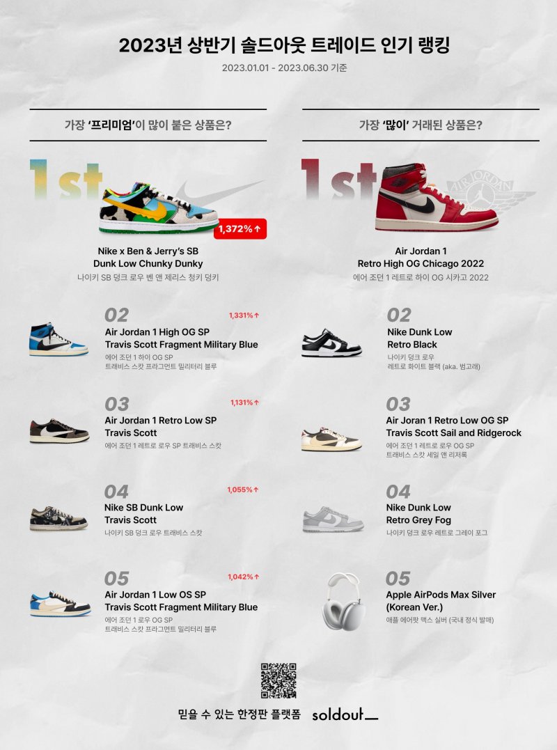 12일 무신사 자회사 에스엘디티(SLDT)가 운영하는 한정판 플랫폼 솔드아웃에 따르면 올해 1~6월 개인간거래 서비스인 '솔드아웃 트레이드'에서 거래된 상품 중 발매가 대비 재판매 거래액이 가장 많이 오른 제품 1위는 1372% 상승한 '나이키 SB 덩크 로우 벤 앤 제리스 청키 덩키'다.