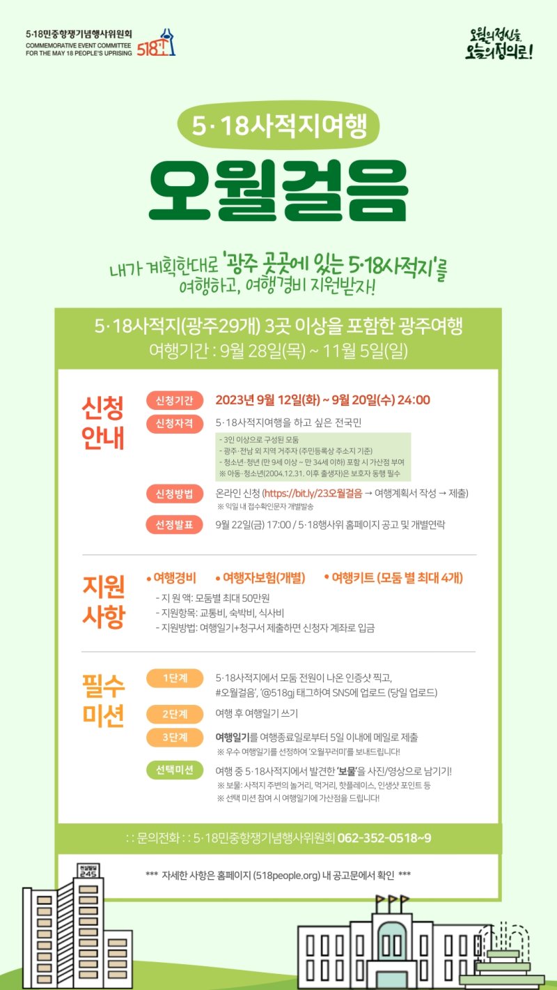 5‧18사적지여행 '오월걸음'은 가족, 친구 등과 함께 광주와 5‧18사적지 3곳 이상을 방문해 인증하고, 광주 5·18사적지 여행코스를 개발한 뒤 여행비를 지원받는 프로그램이다.
