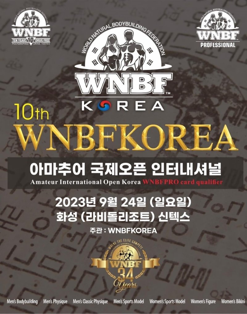 세계내추럴보디빌딩협회(WNBF) 한국 사무국이 주관하는 '제10회 WNBF 코리아 아마추어 국제오픈 인터내셔널 대회가 24일 경기도 화성 라비돌리조트 신텍스에서 열린다.