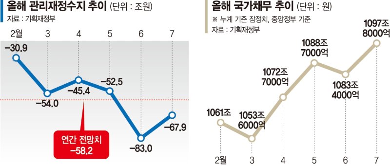 통합·관리 재정수지에서 모두 적자폭이 줄고 있지만 재정건전성 우려는 여전하다. 우선 7월 말 현재 관리재정수지만 해도 올해 정부 목표보다 적자폭이 더 컸다. 정부의 올해 관리재정수지 적자는 58조2000억원이 목표다. 목표치를 훌쩍 넘긴 117%를 7월에 기록한 것이다. 중앙정부 채무는 7월 말 현재 1097조8000억원이었다. 전월 대비 14조5000억원 늘었다. 지난해 말 대비로는 64조4000억원 증가해 올해 정부 전망치인 1101조7000억원에 근접했다.