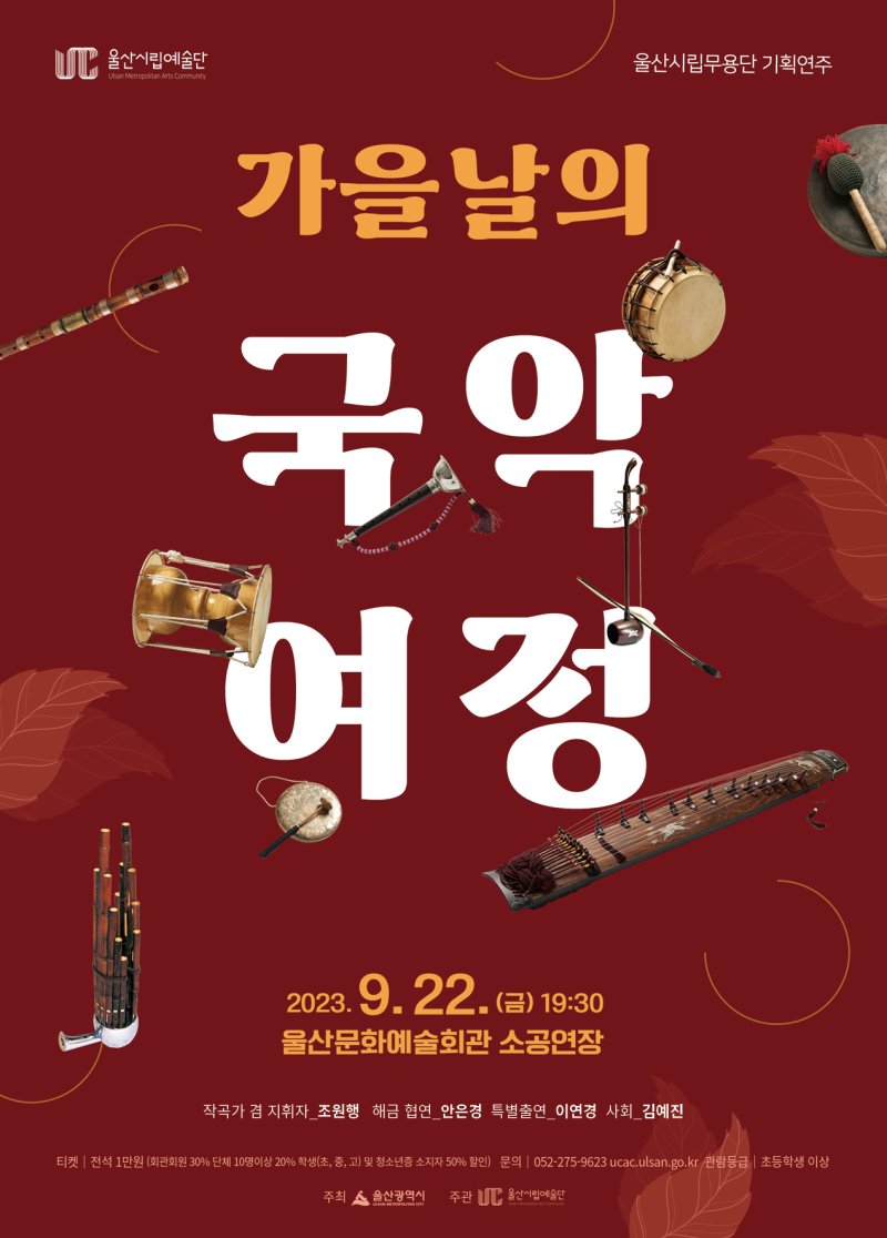 [울산=뉴시스]구미현 기자 = 울산시립무용단 국악 연주팀의 기획공연 ‘가을날의 국악여정’이 오는 22일 오후 7시 30분 울산문화예술회관 소공연장에서 펼쳐진다.