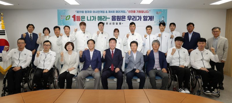 (청주=뉴스1) 박재원 기자 = 중국 항저우 아시안게임(19회)에 출전하는 충북 청주시청 직장운동경기부 소속 국가대표 선수단이 15일 '금빛 사냥' 의지를 다졌다.