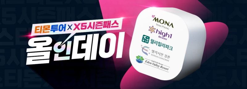 이날 단 하루 티몬이 전국 인기 스키장 5곳을 마음껏 즐길 수 있는 X5 시즌패스를 단독 판매한다. 1차 판매는 10월말까지로 19일 올인데이를 활용하면 독보적 혜택으로 시즌패스를 장만할 수 있다.