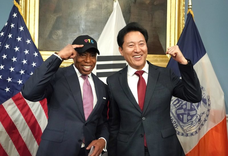 지난 16일부터 북미 출장 중인 오세훈 서울시장은 18일(현지시간) 뉴욕시청에서 에릭 애덤스 뉴욕시장과 만나 경제·사회·기후·문화 등 다양한 분야에서 교류 확대 및 상호협력을 위한 친선도시 양해각서(MOU)를 체결했다.