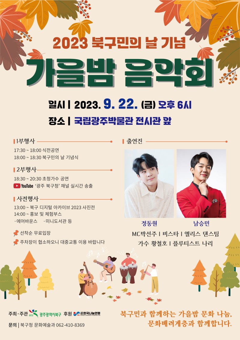 북구민 가을밤 음악회에서는 주민들의 흥을 돋우고 가을밤 낭만을 만끽할 수 있는 정동원, 남승민 등 초청 가수의 축하 공연이 펼쳐진다.